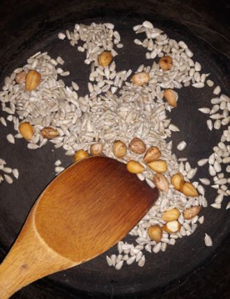 Semintele si alunele se trag un pic intr-o tigaie, pe foc moale ca sa se rumeneasca.
