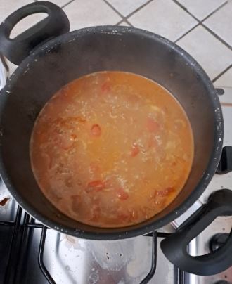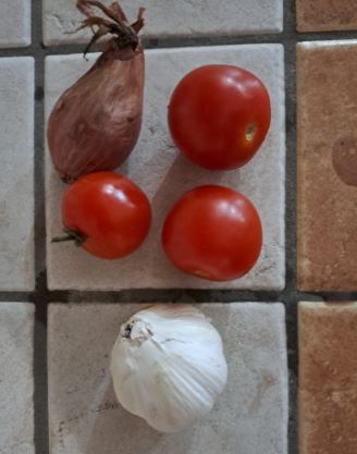 Intr-o cratita punem ulei de masline, piper si sare. Calim ceapa pana devine sticloasa si apoi punem la calit si rosiile.
