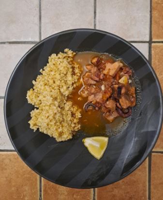 Cat timp se prajeste pestele, curatam caracatita, ii inlaturam stomacul, o spalam si o taiem bucati.